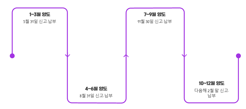 장외주식 양도 시 발생하는 양도소득세는 양도일이 속하는 분기의 다음 달 말일까지 신고 및 납부해야 합니다.