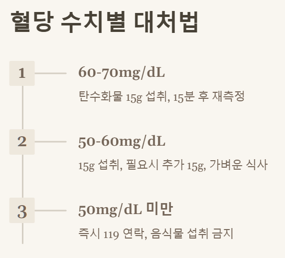 ⚠️ 주의: 의식 변화가 있거나 스스로 음식을 섭취하기 어려운 심한 저혈당 상황에서는 즉시 119에 연락하거나 주변 사람에게 도움을 요청해야 합니다. 강제로 음식을 먹이면 질식 위험이 있어요! 이런 상황에서는 절대 혼자 해결하려 하지 마세요. 주변에 알리는 것이 최우선입니다.