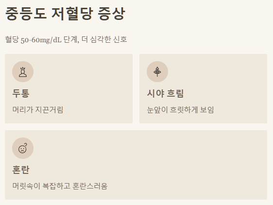 • 중등도 저혈당 (혈당 50-60mg/dL): 머리가 지끈거리는 두통, 눈앞이 흐릿하게 보이는 시야 흐림, 말이 어눌해지거나 어색해지는 변화, 사소한 일에도 짜증이 나거나 화가 나는 감정 변화, 머릿속이 복잡하고 혼란스러운 느낌, 극심한 피로감이나 기운 없음 등이 동반됩니다. 이 단계에서는 다른 사람들이 눈치챌 수 있는 외적인 변화도 나타나기 시작해요.