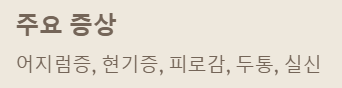 주요 증상으로는 어지럼증, 현기증, 피로감, 두통, 심하면 실신 등이 있어요.