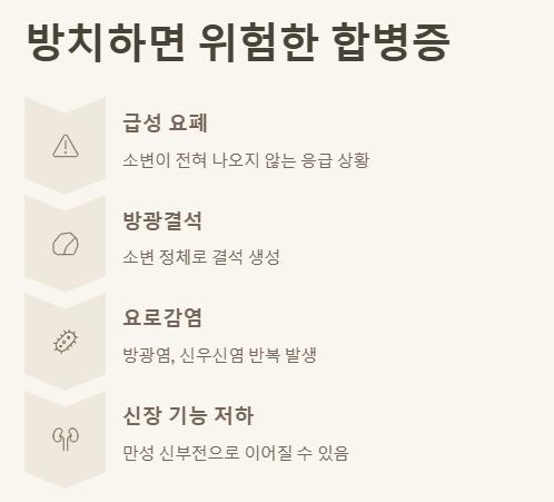 - 요로감염: 소변이 정체되면 세균 증식이 쉬워져 방광염, 신우신염 등 요로감염이 반복될 수 있습니다.