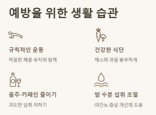 완벽한 예방법은 없지만, 건강한 생활 습관은 증상 완화 및 진행 지연에 도움이 될 수 있습니다. 저는 규칙적인 운동, 적절한 체중 유지, 과도한 음주나 카페인 섭취 줄이기, 채소와 과일이 풍부한 식단 유지 등을 추천하고 싶어요. 특히 밤에는 수분 섭취를 줄이는 것이 야간뇨 증상 개선에 도움이 될 수 있습니다.