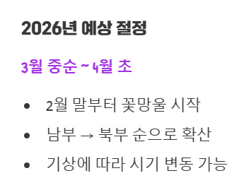 | 지역 | 예상 개화 시기 (2026년) | 주요 명소 |