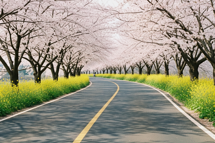 3월 말에서 4월 초에 방문하시면 도로 양옆으로 유채꽃과 벚꽃이 환상적으로 어우러진 풍경을 감상하실 수 있어요.
