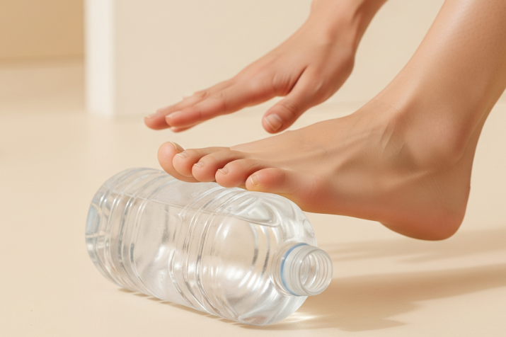 얼린 물병이나 캔을 발바닥 아래에 두고 앞뒤로 굴려주는 마사지는 염증 완화와 족저근막 이완에 효과적이에요.