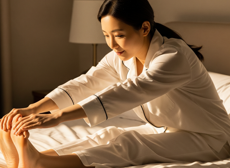- 발가락 당기기: 앉은 자세에서 발을 반대쪽 무릎에 올리고, 손으로 발가락을 발등 쪽으로 당겨 15초간 유지. 3회 반복.