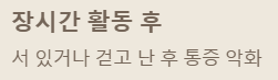 ✔️ 장시간 서 있거나 걷는 후 통증이 심해진다면 의심해봐야 합니다.
