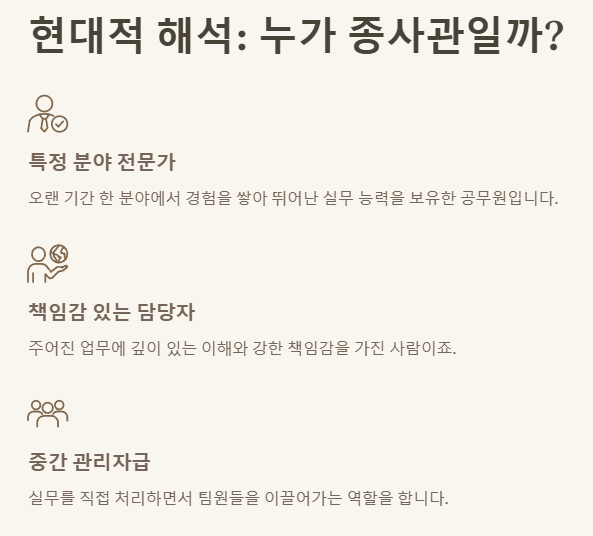 하지만! 우리가 '종사관'이라는 단어를 들었을 때 떠올리는 이미지, 즉 '특정 분야에 오랫동안 종사하며 전문성을 가진 실무자'라는 의미는 현대 공무원 사회에도 여전히 유효합니다. 제 생각에는 이런 사람들이야말로 현대의 '종사관'이라고 불릴 만한 분들이 아닐까 싶어요.
