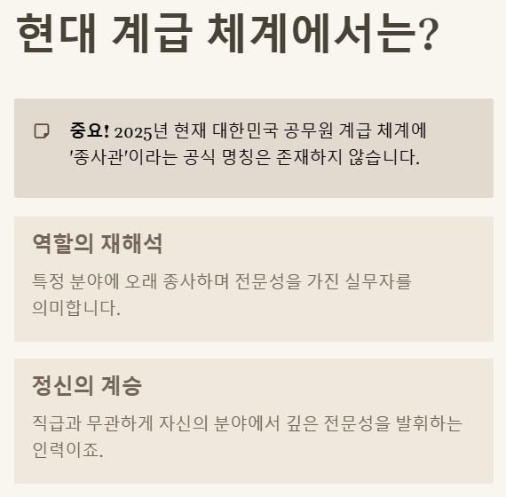 - 2. 현대 공식 계급에는 '종사관'이 존재하지 않습니다: 2025년 현재 대한민국 공무원 체계에 이런 명칭은 없습니다.