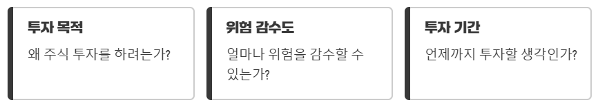 “나는 왜 주식 투자를 하려는가?”, “얼마나 위험을 감수할 수 있는가?”, “언제까지 투자할 생각인가?” 이런 질문들이요.