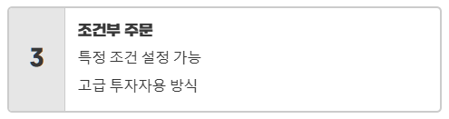 조건부 지정가/최유리 지정가: 특정 조건(예: 시장가로 주문하되, 특정 가격에 도달하지 못하면 자동으로 취소)을 걸어두는 고급 주문 방식이에요.