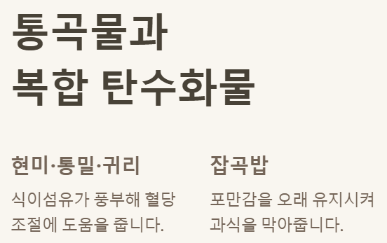 | 탄수화물 | 현미, 통밀빵, 귀리, 잡곡 | 흰쌀밥, 흰빵, 과자, 케이크 |
