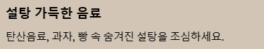 | 음료 | 물, 녹차, 블랙커피 | 탄산음료, 설탕 첨가 음료 |