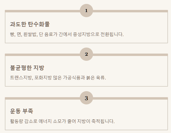 중성지방이 높아지는 원인은 복합적이지만, 대부분 우리가 매일 접하는 생활 습관과 밀접한 관련이 있습니다. 단순히 지방 섭취가 많아서라고 생각하기 쉽지만, 사실은 그렇지 않은 경우도 많아요.