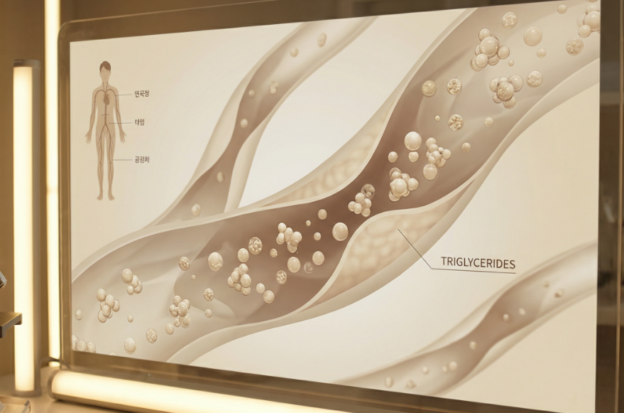 중성지방은 우리 몸에 있는 대표적인 지방의 한 종류로, 혈액 속에 떠다니며 에너지원으로 사용됩니다. 음식을 통해 섭취된 칼로리 중 당장 사용되지 않고 남은 에너지는 간에서 중성지방으로 합성되어 지방 세포에 저장되죠. 필요할 때 에너지로 전환되어 요긴하게 쓰이기도 하지만, 문제는 과도하게 축적될 때 발생합니다.