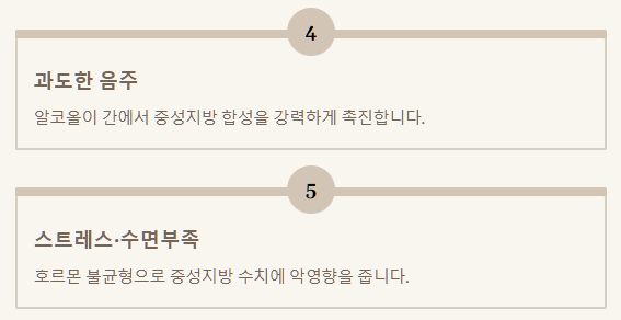 - 스트레스와 수면 부족: 만성적인 스트레스와 부족한 수면은 호르몬 불균형을 초래하여 중성지방 수치에 악영향을 줄 수 있습니다.
