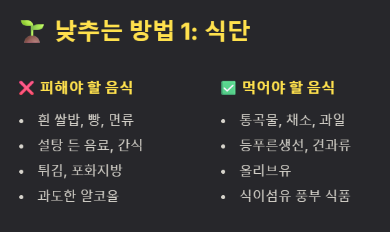 - ✅ 식단 개선이 가장 중요! 정제된 탄수화물과 술을 줄이고 건강한 지방과 식이섬유를 늘리세요.