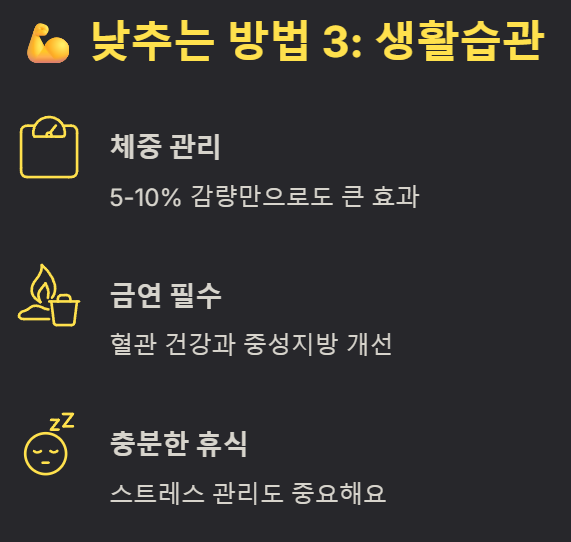 - ✅ 꾸준한 유산소 운동과 적정 체중 유지, 금연은 필수적인 관리 방법입니다.