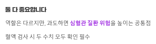하지만 둘 다 과도하게 많으면 심혈관 질환 위험을 높이는 공통점이 있죠.