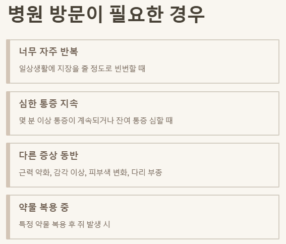 - 쥐가 너무 자주 반복될 때: 일상생활에 지장을 줄 정도로 자주 발생한다면 검진이 필요해요.