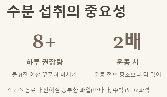 하루 8잔 이상의 물을 꾸준히 마시는 것이 중요해요. 특히 운동 전후, 더운 날씨에는 더욱 신경 써서 수분을 보충해 주세요. 스포츠 음료나 전해질이 풍부한 과일(바나나, 수박 등)도 좋은 선택입니다.