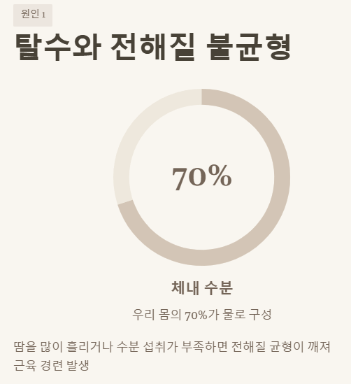 가장 흔한 원인 중 하나가 바로 탈수와 전해질 불균형입니다. 우리 몸은 약 70%가 물로 이루어져 있고, 이 물 속에는 나트륨, 칼륨, 마그네슘, 칼슘 같은 전해질이 녹아 있어요. 이 전해질들은 근육 수축과 이완을 조절하는 데 아주 중요한 역할을 하거든요. 땀을 많이 흘리거나 수분 섭취가 부족하면 이 전해질 균형이 깨지면서 근육 경련이 발생하기 쉬워져요. 아, 운동 후에 유독 쥐가 잘 나는 분들은 이 경우에 해당될 가능성이 높답니다.