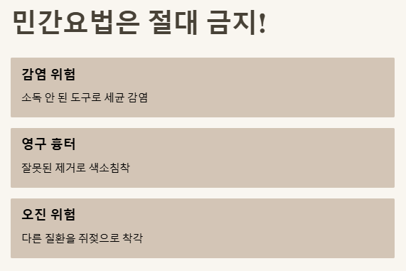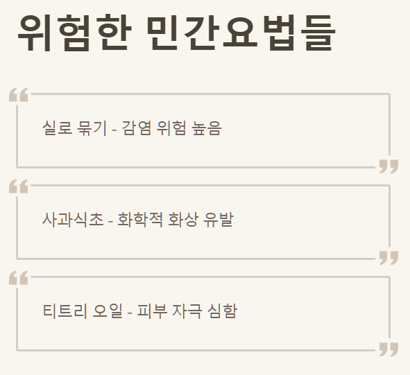 ⚠️ 절대 금지: 검증되지 않은 민간요법은 피하세요! 단기적으로는 효과가 있는 것처럼 느껴질지 몰라도, 장기적으로는 더 큰 피부 문제를 일으킬 수 있습니다. 소중한 피부를 위해 반드시 전문가의 도움을 받으세요.