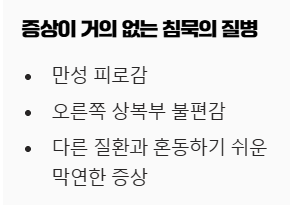 초기에는 대부분 증상이 없거나, 있더라도 만성 피로감, 오른쪽 상복부 불편감 등 다른 질환과 혼동하기 쉬운 막연한 증상들이라 그냥 지나치기 일쑤예요.