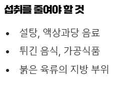 • 섭취를 줄여야 할 것: 설탕, 액상과당이 들어간 음료와 가공식품, 튀긴 음식, 붉은 육류의 지방 부위, 버터, 마가린 등 포화지방과 트랜스지방이 많은 음식은 피하는 것이 좋습니다.