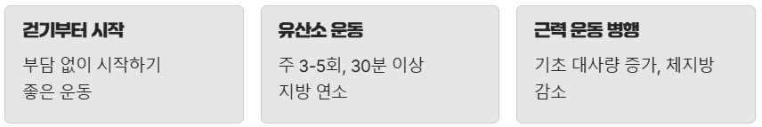 저는 처음에는 걷기부터 시작해서 점차 유산소 운동 시간을 늘리고, 가벼운 근력 운동을 병행했어요.