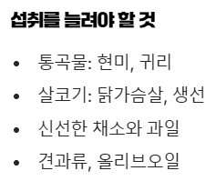 • 섭취를 늘려야 할 것: 통곡물(현미, 귀리), 살코기(닭가슴살, 생선), 콩류, 신선한 채소와 과일, 견과류, 올리브 오일 등 건강한 탄수화물, 단백질, 불포화지방이 풍부한 식품 위주로 드세요.