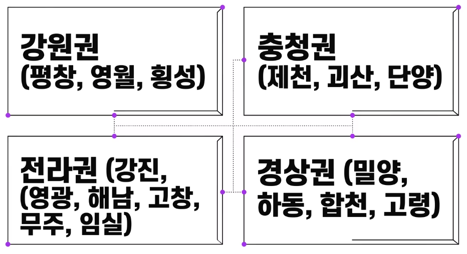 | 경상권 | 밀양, 하동, 합천, 고령 |