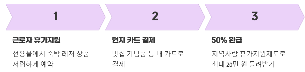 - 지역사랑 휴가지원: 여행지에서 쓴 '내 돈'의 50%를 나중에 지역상품권으로 돌려받는 '현장 영수증' 기반 방식