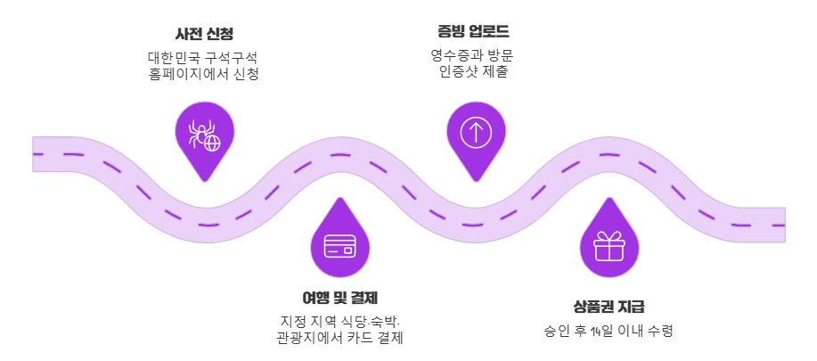 - 여행 및 결제: 지정 지역 내 식당, 숙박, 유료 관광지 이용 (카드 결제 권장)