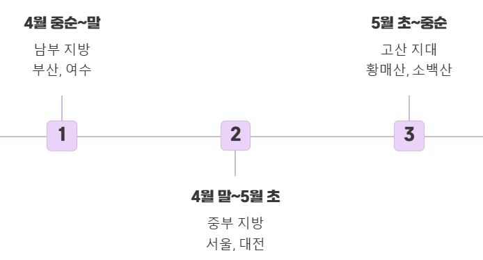 고산 지대 (황매산, 소백산 등) 5월 초 ~ 5월 중순 (일부 5월 말) 늦봄까지 철쭉을 만끽할 수 있음