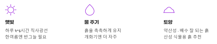 • 비료: 봄철 새싹이 돋아날 때와 꽃이 진 후에 완효성 비료를 주는 것이 좋아요.