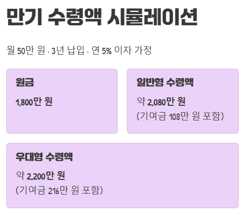 기획재정부와 언론 보도에서 제시한 대표적인 시뮬레이션(월 50만 원, 3년 납입, 연 5% 이자 가정)을 통해 예상 수령액을 알아볼게요.