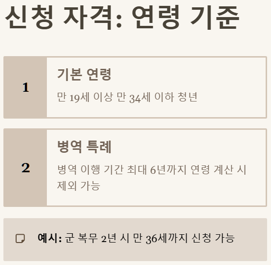 | 연령 기준 | 만 19세 이상 만 34세 이하 청년 (병역 이행 기간은 최대 6년까지 인정되어 연령 계산 시 제외 가능) |