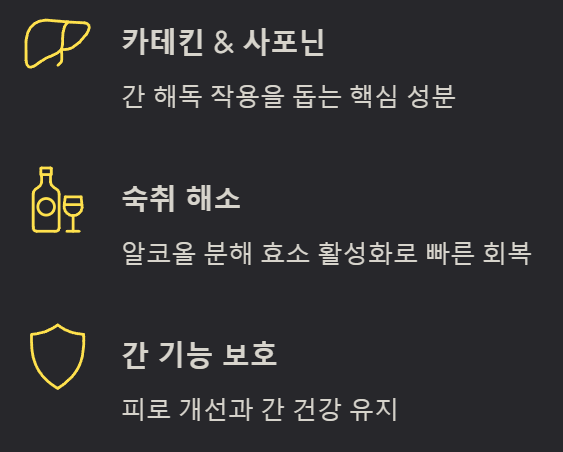 - 간 해독: 숙취 해소와 간 기능 보호에 도움을 줍니다.