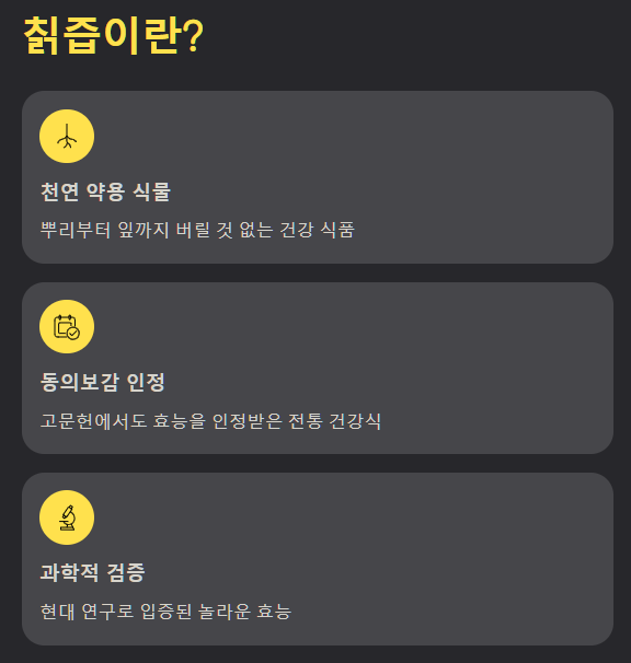 | 칡 | 이소플라본, 사포닌, 폴리페놀 | 갱년기 증상 완화, 간 기능 개선, 혈액순환, 항산화 |