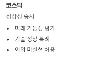 코스닥 시장은 코스피에 비해 상장 요건이 상대적으로 완화되어 있어요.