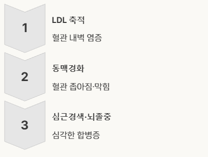 하지만 LDL-C 수치가 계속 높게 유지되면 혈관 내벽에 콜레스테롤이 쌓여 염증 반응을 일으키고, 결국 혈관이 좁아지거나 막히는 '동맥경화'로 이어질 수 있어요.