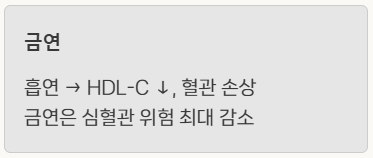 • 금연: 흡연은 HDL-C 수치를 낮추고 LDL-C를 산화시켜 혈관 손상을 촉진합니다.