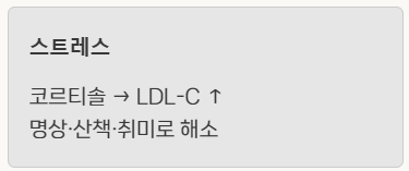 • 스트레스 관리: 만성 스트레스는 코르티솔과 같은 호르몬 분비를 촉진하고, 이는 LDL-C 수치를 높이는 데 기여할 수 있습니다.