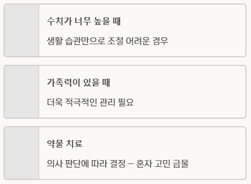 생활 습관 개선만으로 충분히 조절되는 경우도 있고, 약물 복용 중에도 생활 습관 개선을 통해 용량을 줄이거나 중단하는 경우도 있어요.