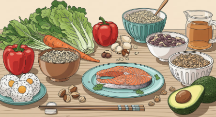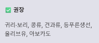 • 권장 식품: 식이섬유가 풍부한 채소(귀리, 보리), 콩류, 견과류(아몬드, 호두), 등푸른생선(고등어, 연어) 등을 충분히 섭취하세요.
