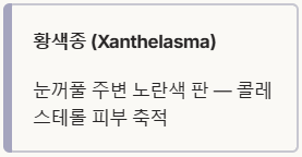 • 황색종 (Xanthelasma): 눈꺼풀 주변에 노란색 또는 오렌지색의 부드러운 판이 생기는 증상이에요.