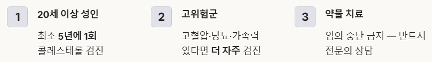 💡 팁: 콜레스테롤 수치는 겉으로 드러나는 증상이 없기 때문에 더욱 꾸준한 관리가 필수예요.