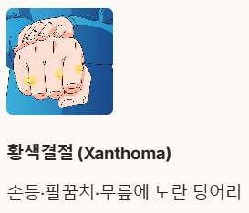 • 황색결절 (Xanthoma): 피부나 힘줄에 콜레스테롤이 쌓여 생기는 단단한 덩어리입니다.