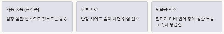 가슴 통증, 호흡 곤란, 뇌졸중 전조 증상은 이미 심각한 단계이므로 즉시 병원에 가야 합니다.